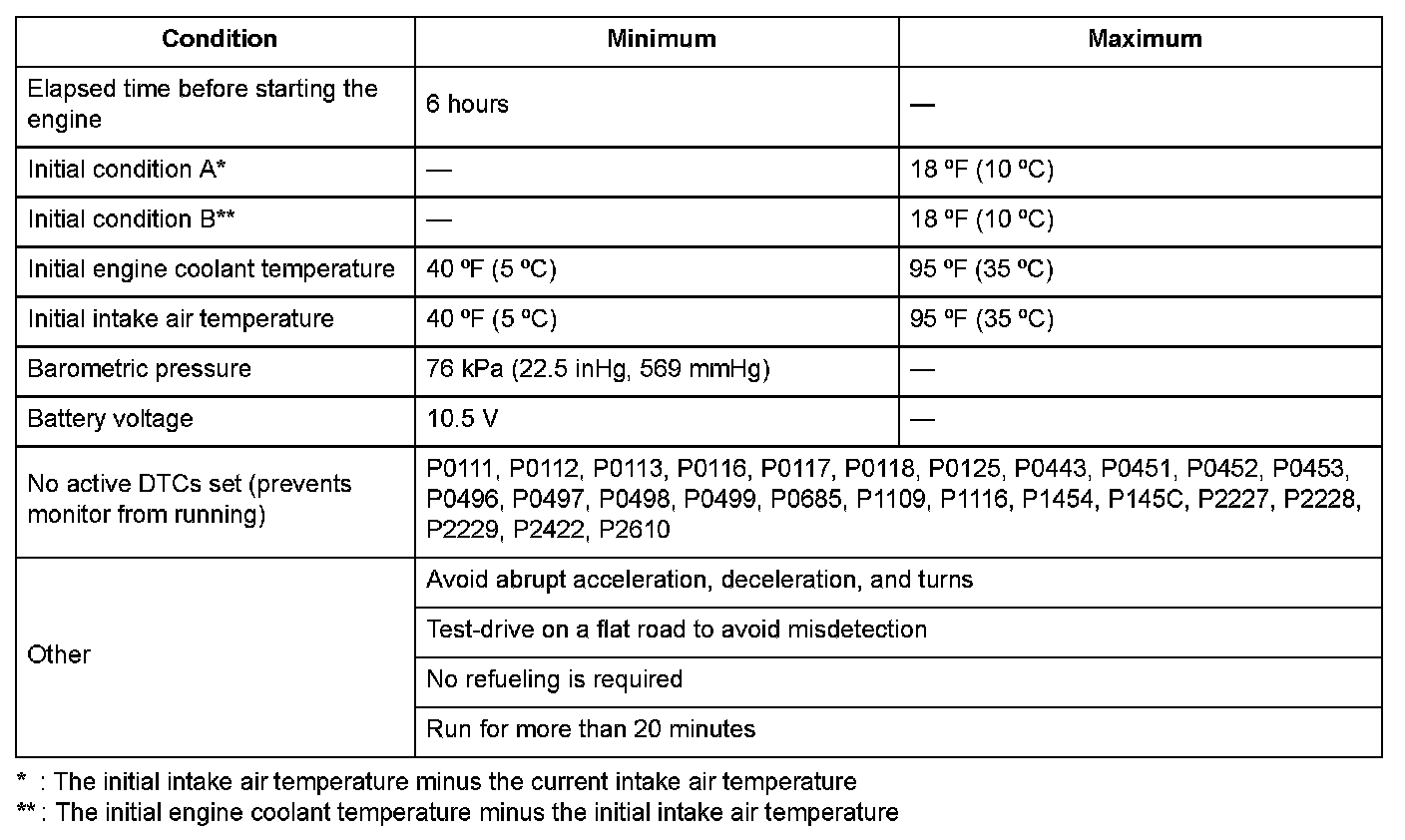 When a malfunction is detected during the first drive cycle with the engine coolant temperature and intake air temperature at engine start-up within the specified temperature range, a Pending DTC is stored in the ECM memory. If the malfunction returns in the next (second) drive cycle with the engine coolant temperature and intake air temperature at engine start-up within the specified temperature range, the MIL comes on and a Confirmed DTC and the freeze data are stored.