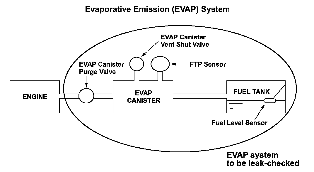 The evaporative emission (EVAP) leak detection system uses an engine off natural vacuum (EONV) method. The EONV method detects leakage from the change in fuel tank pressure via the fuel tank pressure (FTP) sensor with the engine off.
