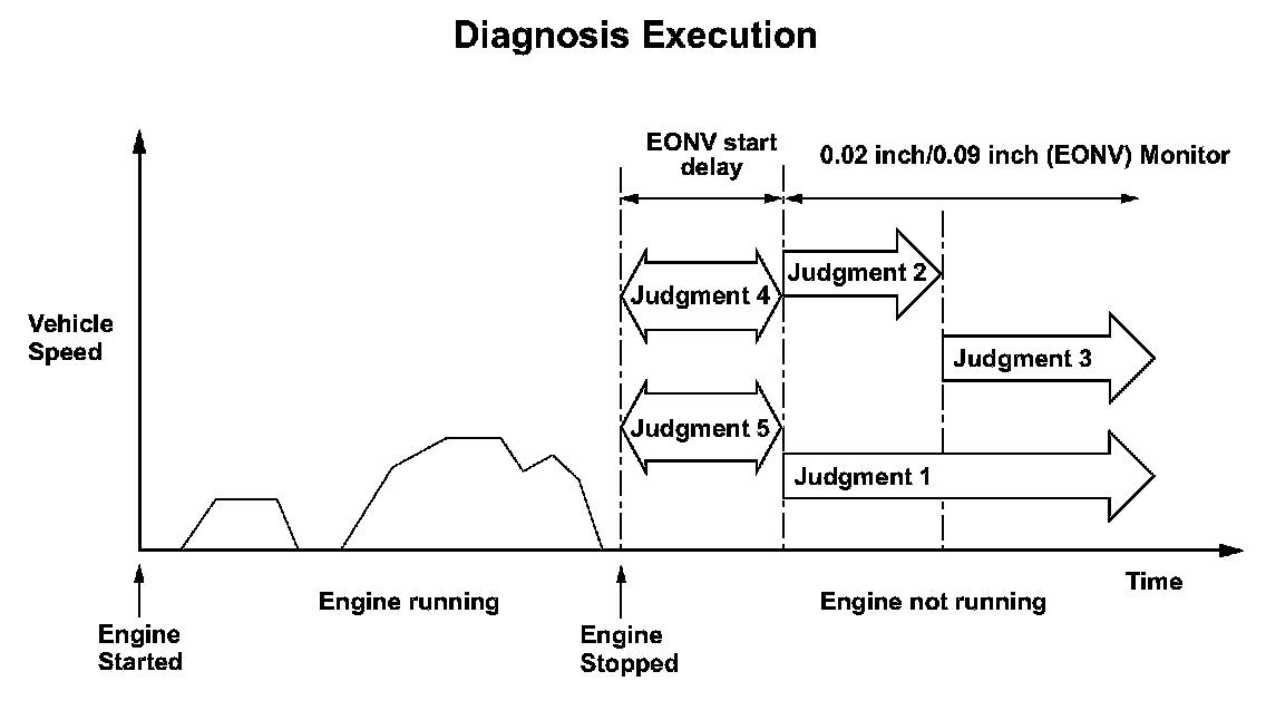 After the engine has stopped, the engine control module (ECM) monitors the variation of the FTP sensor output to detect "no 0.09 inch leak" depending on the variation of the pressure inside the fuel tank.