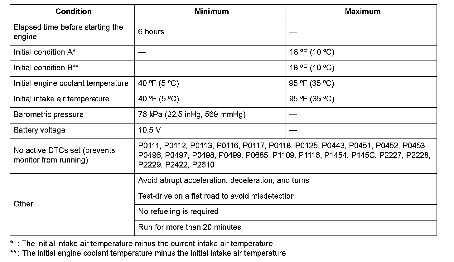 1. After the vehicle has been left for an appropriate amount of time as specified, with the engine coolant temperature and intake air temperature within the specified range, start the engine.