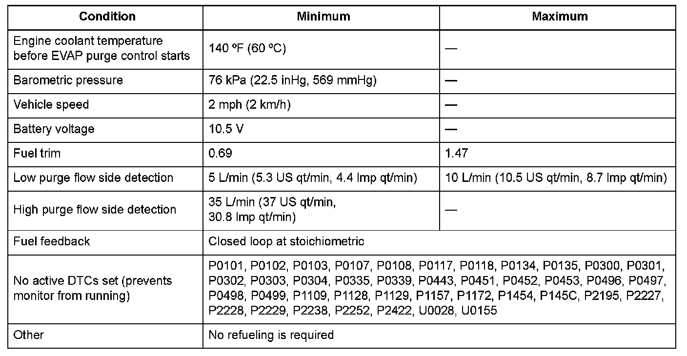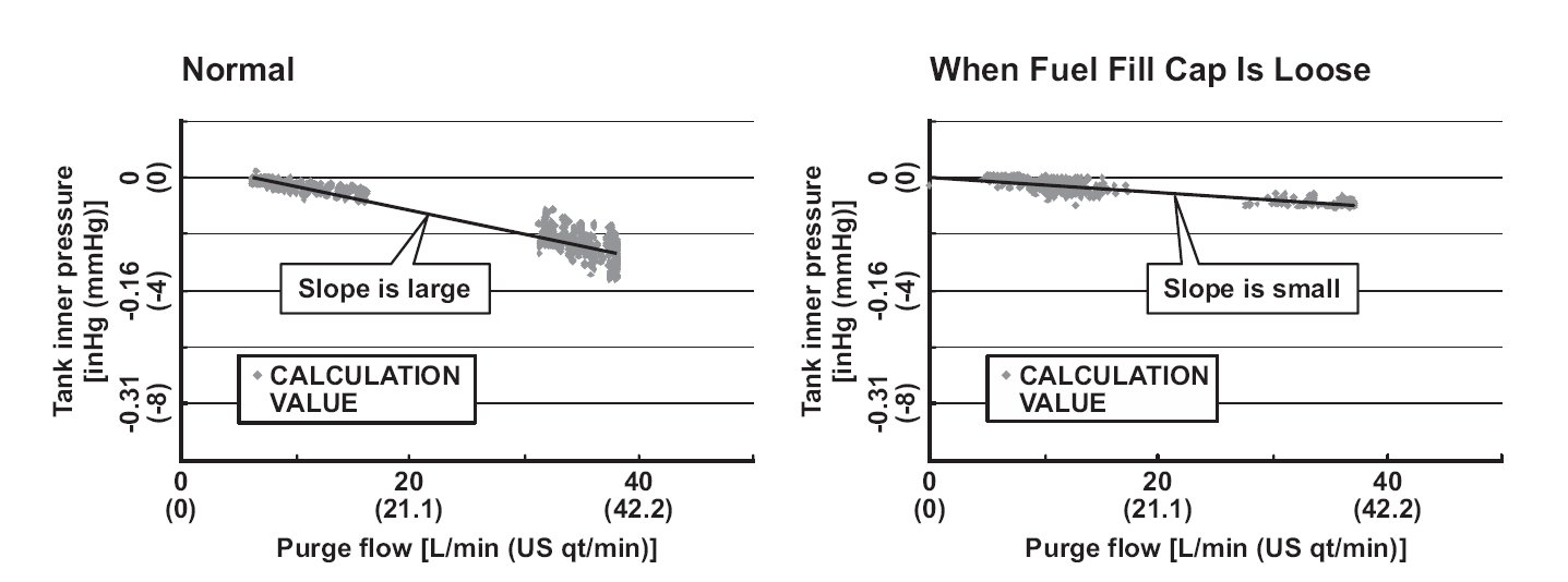 When the fuel fill cap is installed properly, purge flow occurs due to the airflow resistance of the canister, and tank pressure will be reduced. When the fuel fill cap is loosened, the fuel tank pressure will not decrease even when the airflow resistance decreases and purge flow occurs, because air is being vented from the tank to the atmosphere. By checking the fuel tank pressure with various purge flows, and using the above characteristics, a loose fuel fill cap is detected. The engine control module (ECM) calculates the relationship of the purge flow and fuel tank pressure (FTP) sensor, and when the slope of the decreasing fuel tank pressure to the purge flow increase is small, the ECM detects a loose fuel fill cap and stores a DTC. The failure detection is normally done during purge.