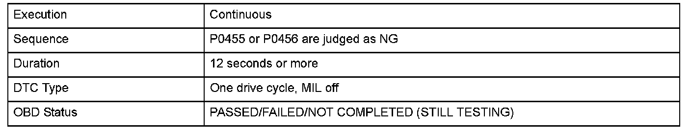 The output from the fuel cap monitor is 0.028 or less for at least 12 seconds (when there is no NG judgment history in this drive cycle).