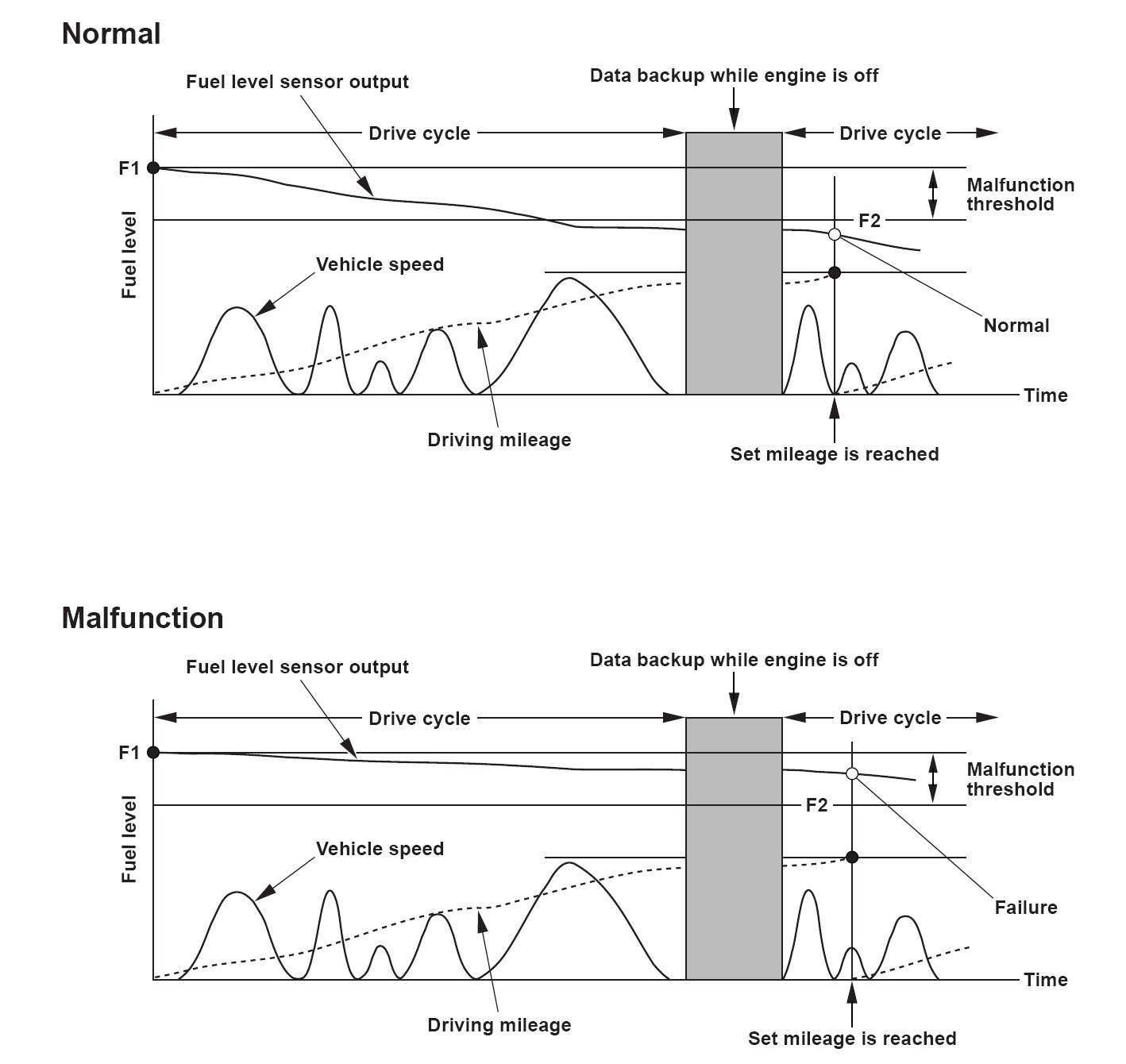 The fuel level sensor is incorporated with the fuel pump and installed in the fuel tank. Using a built-in potentiometer and float, it converts the movement of the float into electrical signals that correspond to the fuel level, and it indicates the amount of fuel in the fuel tank. If the engine control module (ECM)/powertrain control module (PCM) receives no change in the fuel level sensor output after driving for a specified number of miles, it detects a malfunction and stores a DTC.