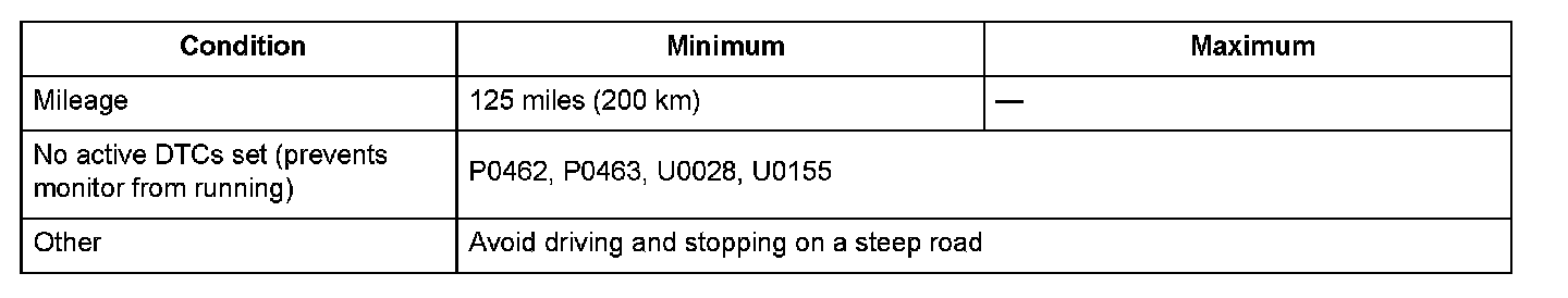 Drive for 125 miles (200 km) or more under Enable Conditions (see "Other") without refueling (turning the ignition switch to LOCK (0) is acceptable).