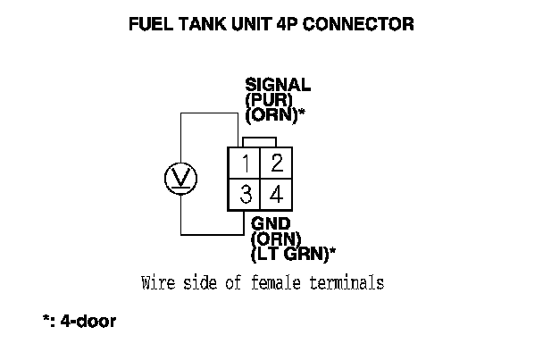 9. Measure the voltage between fuel tank unit 4P connector terminals No. 1 and No. 3.