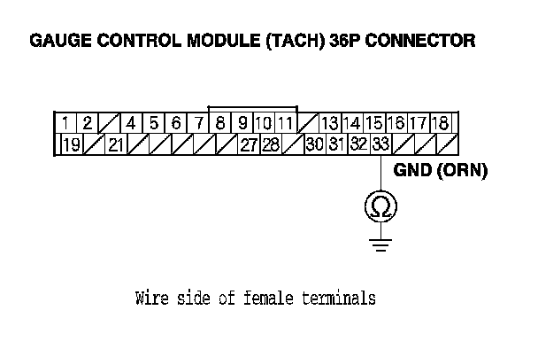 14. Check for continuity between gauge control module (tach) 36P connector terminal No. 33 and body ground.