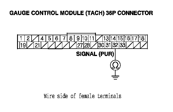 16. Check for continuity between gauge control module (tach) 36P connector terminal No. 32 and body ground.