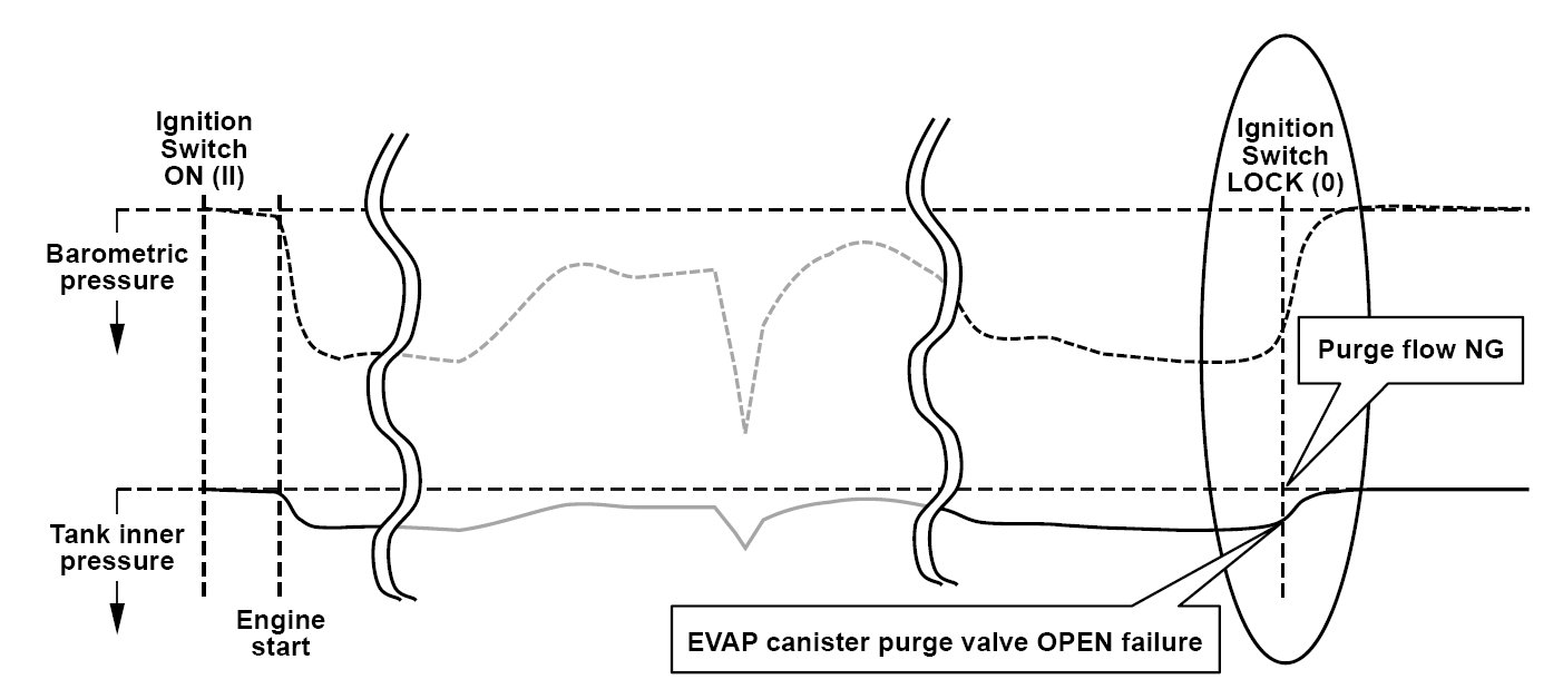 The EVAP canister purge valve opens normally (EVAP canister purge valve OPEN OK) and detects that the purge flow is normal when the pulse of the EVAP canister purge valve duty cycle is transmitted to the fuel tank pressure (FTP) sensor during purge flow (pulse method).