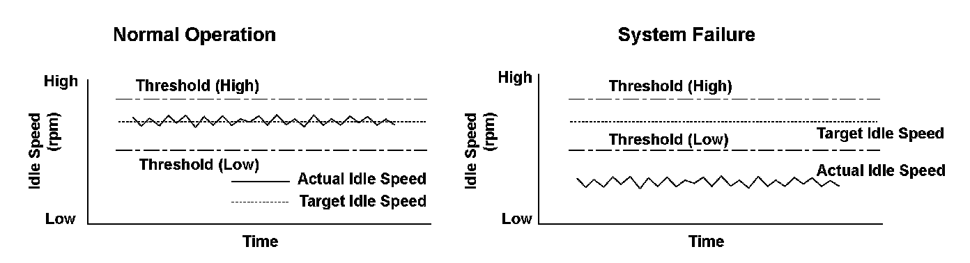 A target idle speed that meets the engine operating conditions (coolant temperature, A/C ON or OFF, etc.) is stored in the engine control module (ECM). The ECM monitors and controls the idle speed so that the actual idle speed is equal to the target idle speed. If the actual idle speed varies beyond a specified value from the target speed over a certain period of time, the ECM detects a malfunction in the idle speed control system and stores a DTC.