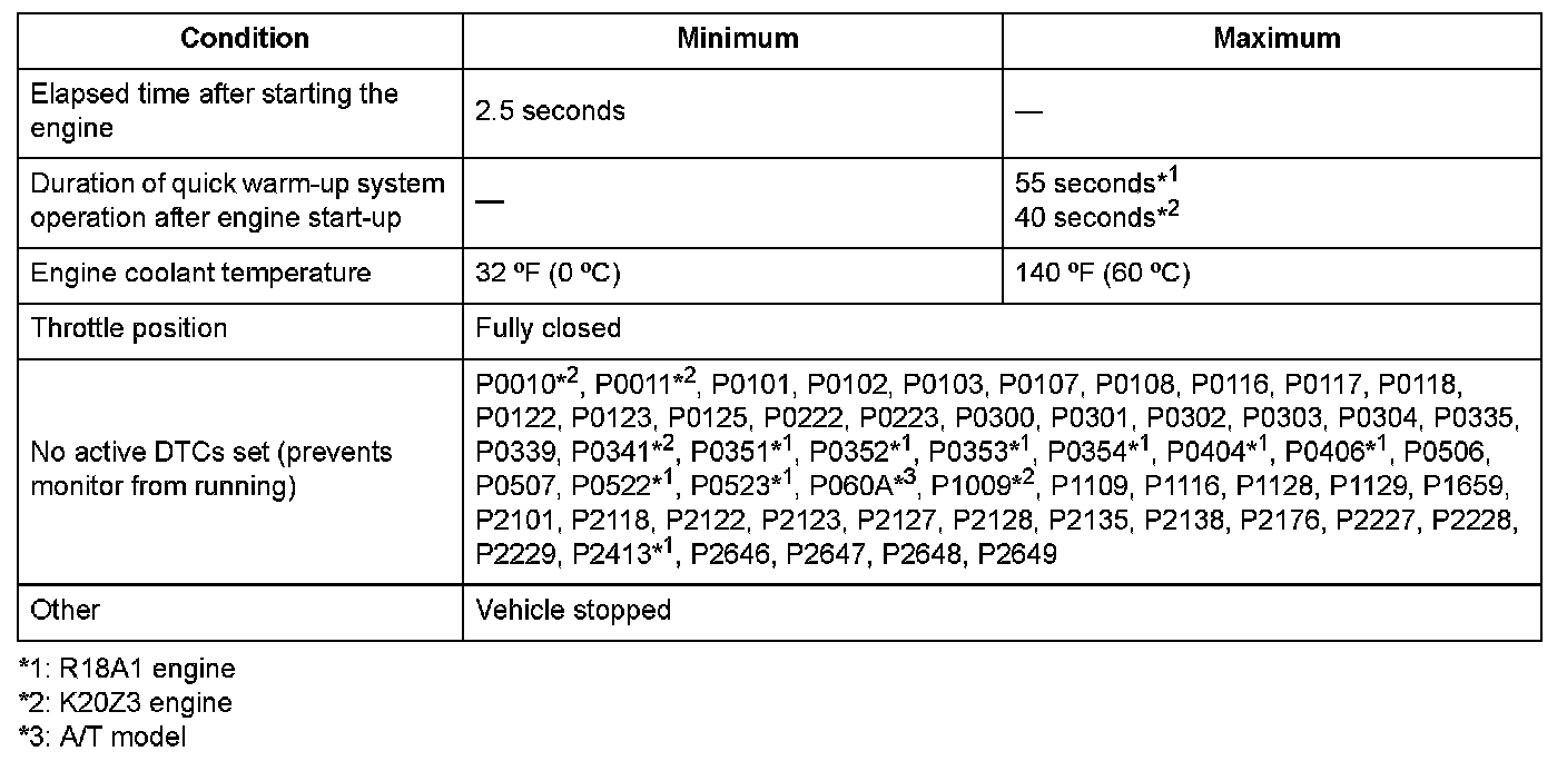 The quick warm-up system supplies additional air and retards the ignition timing when the engine is cold to activate the catalytic converter as quickly as possible. When the actual engine speed is a specified fast idle value, and it continues for a specified time, the engine control module (ECM)/powertrain control module (PCM) detects a malfunction and stores a DTC.