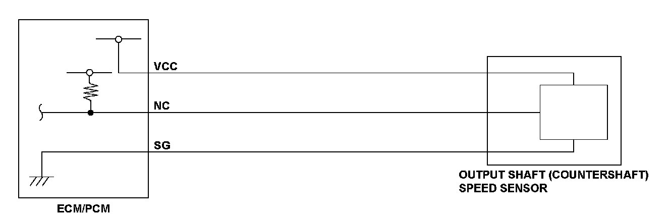 The output shaft (countershaft) speed sensor is attached to the transmission housing to sense output shaft (countershaft) revolutions. The engine control module (ECM)/powertrain control module (PCM) determines the vehicle speed according to the signal from the output shaft (countershaft) speed sensor for the control units. If no signal from the output shaft (countershaft) speed sensor is received for a set time, the ECM/PCM detects a malfunction and stores a DTC.