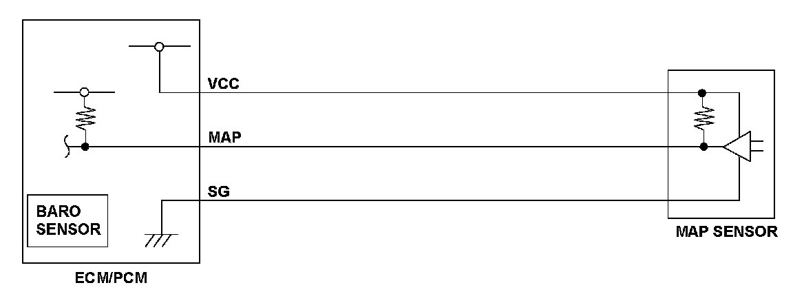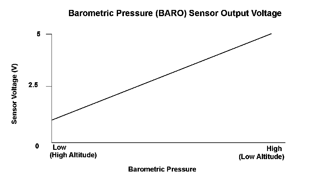 The barometric pressure (BARO) sensor is built into the engine control module (ECM)/powertrain control module (PCM), and it monitors atmospheric pressure. The ECM/PCM estimates appropriate intake airflow from the manifold absolute pressure (MAP) sensor output voltage and the BARO sensor output voltage. If the BARO sensor output voltage is a specified range, the ECM/PCM detects a malfunction and stores a DTC.