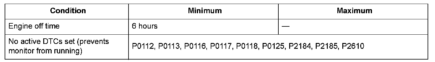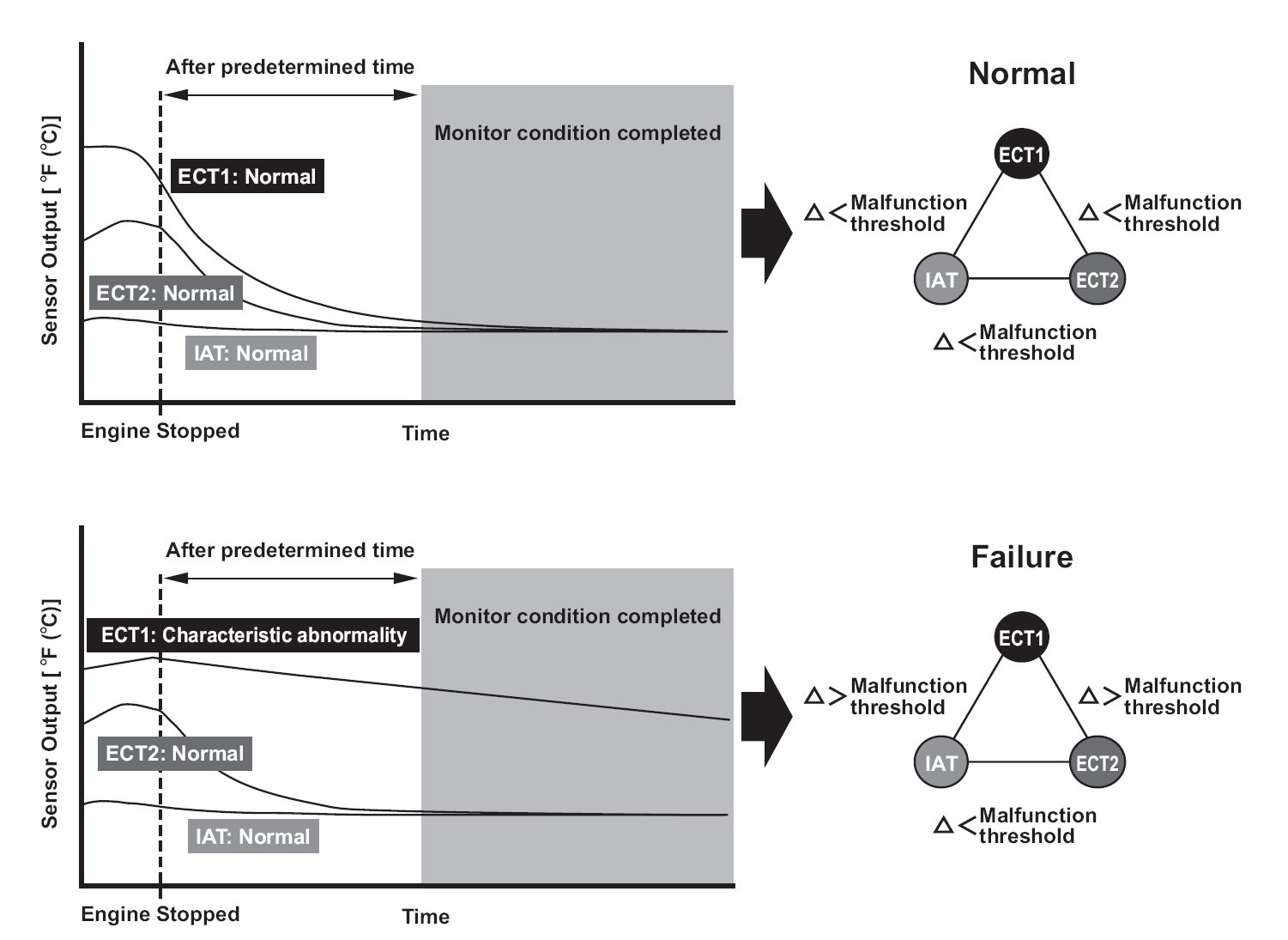 Two engine coolant temperature (ECT) sensors and one intake air temperature (IAT) sensor are used by the engine control module (ECM)/powertrain control module (PCM). When the engine is stopped and enough time has passed, the temperature of the engine will equalize to the ambient temperature. When an inappropriate temperature is detected after comparing the temperature readings of each sensor, the ECM/PCM detects a malfunction in the corresponding sensor and stores a DTC.