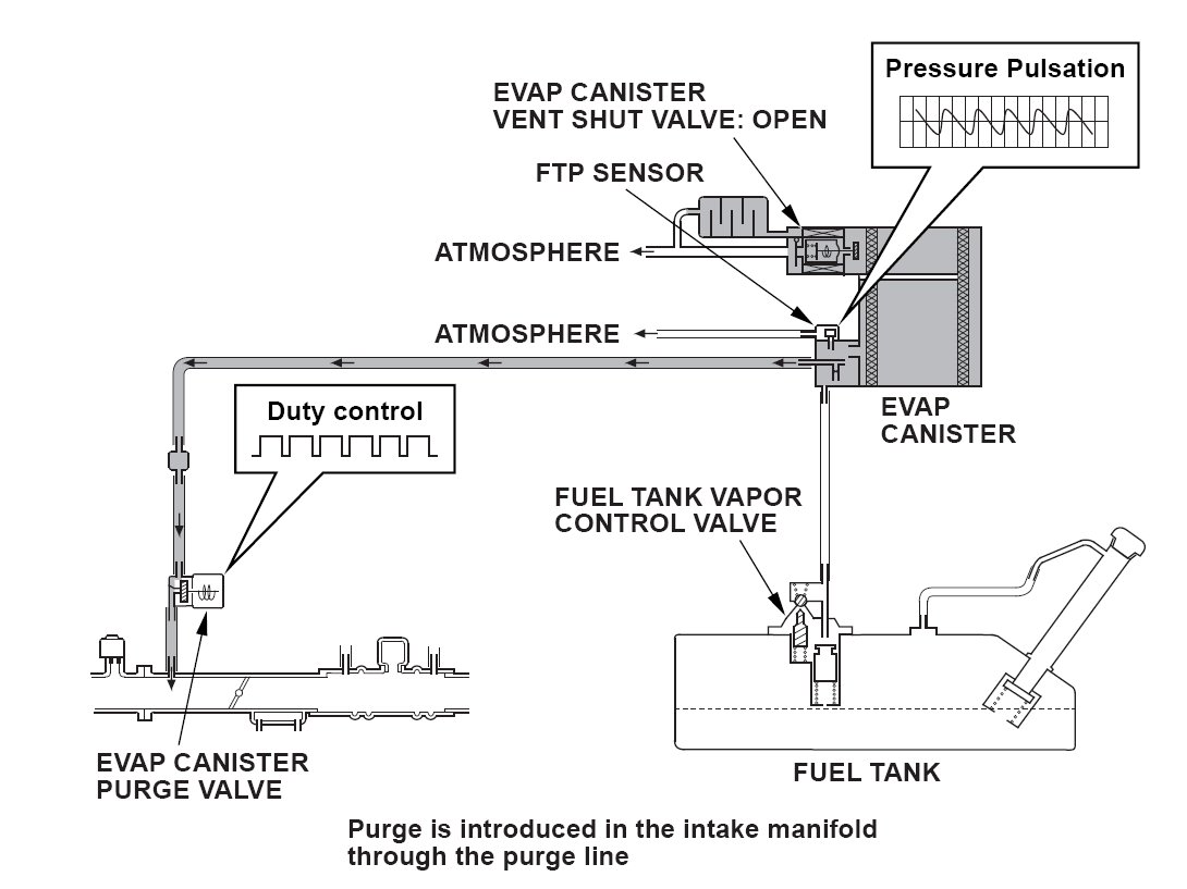 The fuel vapor in the fuel tank is temporarily stored in the evaporative emission (EVAP) canister and drawn into the engine through the EVAP canister purge valve. The engine control module (ECM) controls the amount of vapor introduced into the engine by varying the duty cycle of the EVAP canister purge valve according to the condition of the engine.
