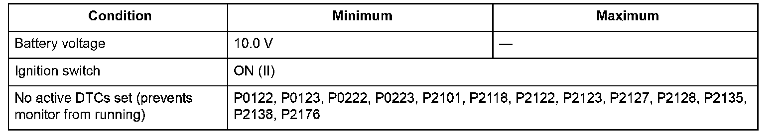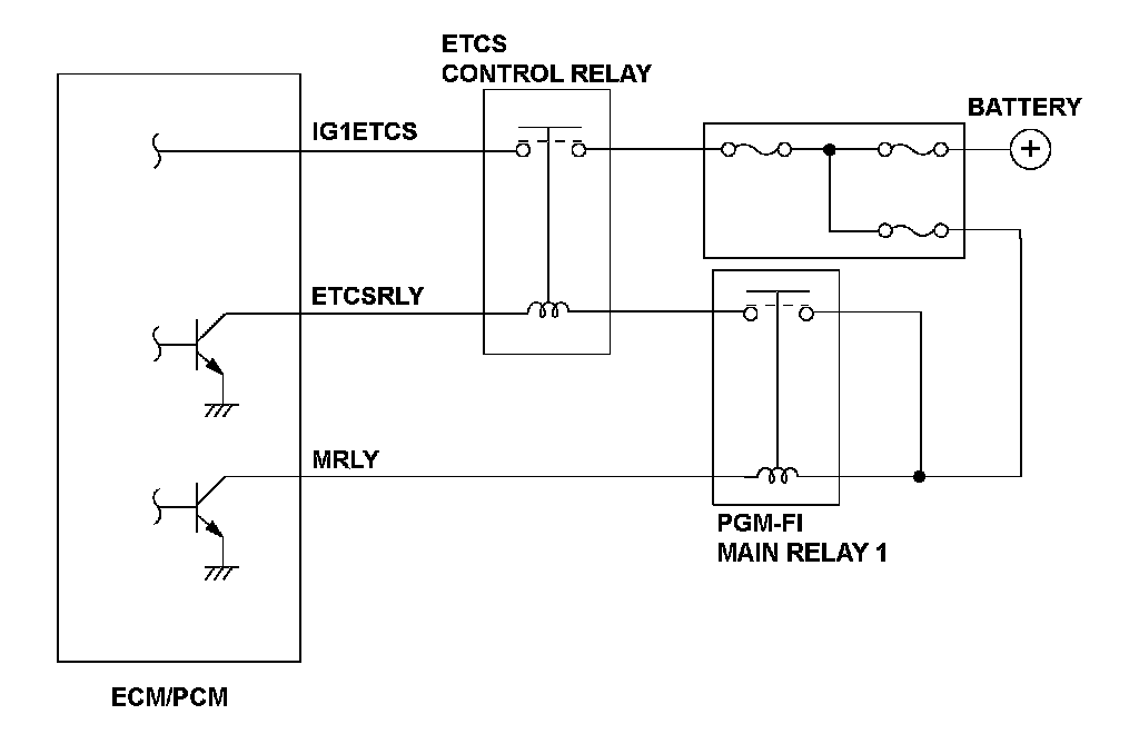 The electronic throttle control system controls the throttle valve opening. The system includes the throttle actuator, the throttle valve, throttle position (TP) sensors A and B, the electronic throttle control system (ETCS) control relay, the accelerator pedal position (APP) sensor, and the engine control module (ECM)/powertrain control module (PCM). When the accelerator pedal is pressed, the APP sensor detects the accelerator pedal opening value. The accelerator pedal opening value is converted to a signal in the APP sensor and transmitted to the ECM/PCM to compute the target position. The ECM/ PCM determines the throttle valve target position according to the signal received and operates the throttle actuator to move the throttle valve to the target position. The actual throttle valve position is determined by TP sensors A and B (installed in the throttle body). When the voltage from the ETCS control relay is not input for a set time after the ETCS control relay is turned on when the ignition switch is turned to ON (II), or when voltage is not applied for a set time when the throttle actuator is operating, the ECM/PCM detects a malfunction in the ETCS control relay power switch and stores a DTC.