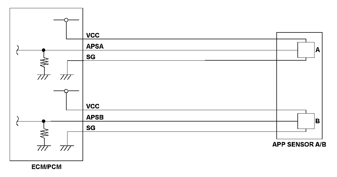 Accelerator pedal position (APP) sensor B is a part of the electronic throttle control system. It is used to convert the position of the accelerator pedal into electrical signals. Based on these signals, the engine control module (ECM)/powertrain control module (PCM) controls the throttle actuator so that the throttle position agrees with the accelerator pedal position. If the signal voltage from APP sensor B is a set value, the ECM/PCM detects a malfunction and stores a DTC.