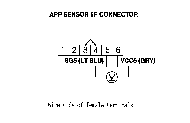 6. Measure the voltage between APP sensor 6P connector terminals No. 5 and No. 6.
