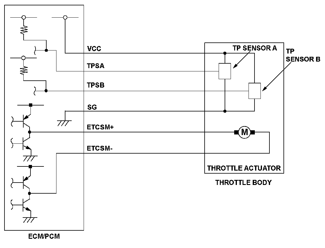 The electronic throttle control system controls the throttle valve opening. The system includes the throttle actuator, the throttle valve, throttle position (TP) sensors A and B, the electronic throttle control system (ETCS) control relay, the accelerator pedal position (APP) sensor, and the engine control module (ECM)/powertrain control module (PCM). When the accelerator pedal is pressed, the APP sensor detects the accelerator pedal opening value. The accelerator pedal opening value is converted to a signal in the APP sensor and transmitted to the ECM/PCM to compute the target position. The ECM/ PCM then operates the throttle actuator to move the throttle valve to the target position. The actual throttle valve position is determined by TP sensor A (installed in the throttle body). The ECM/PCM compares the voltages and the throttle valve positions of TP sensor A and TP sensor B. If the difference of the voltages or the throttle valve positions is a certain value for a set time, the ECM/PCM detects a malfunction in the relationship between TP sensor A and TP sensor B, and stores a DTC.