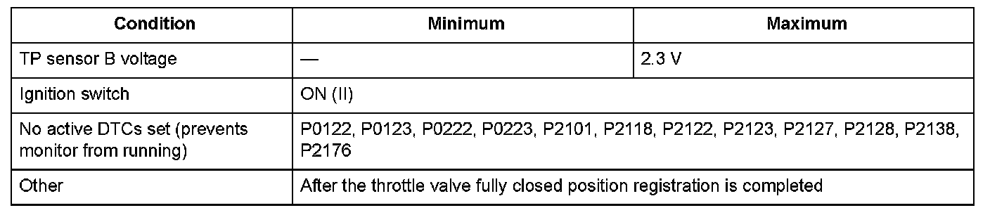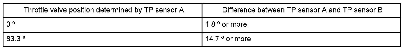 The difference between the throttle valve positions that TP sensor A and TP sensor B determined exceeds the value shown in this table for at least 200 milliseconds.