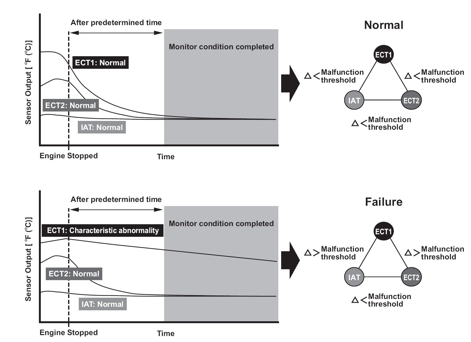 Two engine coolant temperature (ECT) sensors and one intake air temperature (IAT) sensor are used by the engine control module (ECM)/powertrain control module (PCM). When the engine is stopped and enough time has passed, the temperature of the engine will equalize to the ambient temperature. When an inappropriate temperature is detected after comparing the temperature readings of each sensor, the ECM/PCM detects a malfunction in the corresponding sensor and stores a DTC.