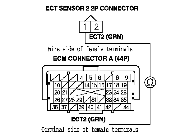 19. Check for continuity between ECT sensor 2 2P connector terminal No. 1 and ECM connector terminal A33.