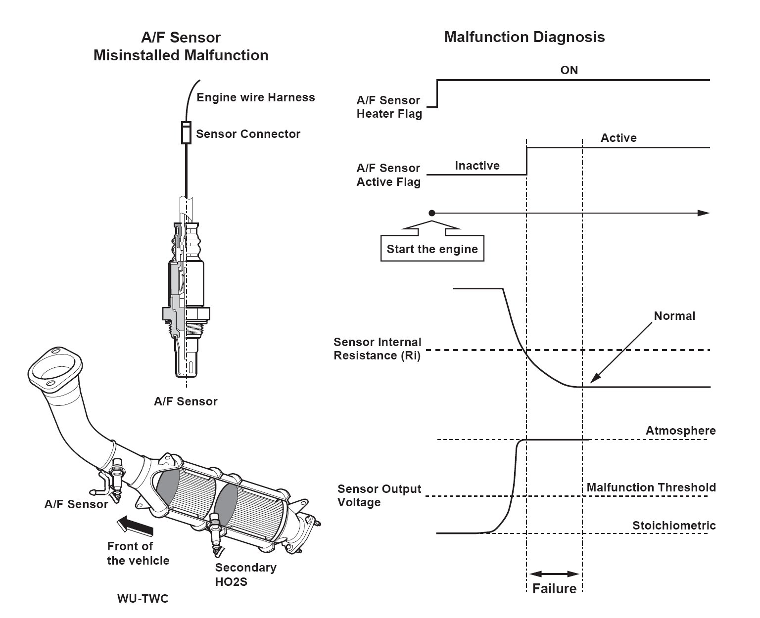 When the air/fuel ratio (A/F) sensor (sensor 1) is properly connected to the engine wire harness, but it is not installed in the exhaust pipe, the feedback is not done properly even if the A/F sensor is active after starting the engine. Thus, the exhaust emissions increase. When the A/F sensor output stays out of the normal range after the A/F sensor becomes active, the engine control module (ECM) detects that the A/F sensor is not properly installed and stores a DTC.