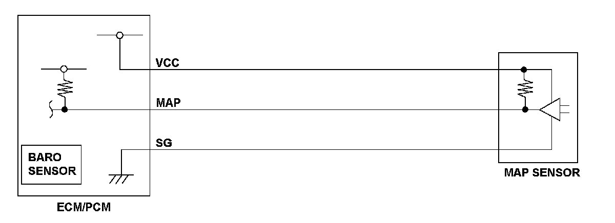 The barometric pressure (BARO) sensor is built into the engine control module (ECM)/powertrain control module (PCM), and it monitors atmospheric pressure. The ECM/PCM estimates appropriate intake airflow from the manifold absolute pressure (MAP) sensor output voltage and the BARO sensor output voltage. If the BARO sensor output voltage is a specified value, the ECM/PCM detects a malfunction and stores a DTC.