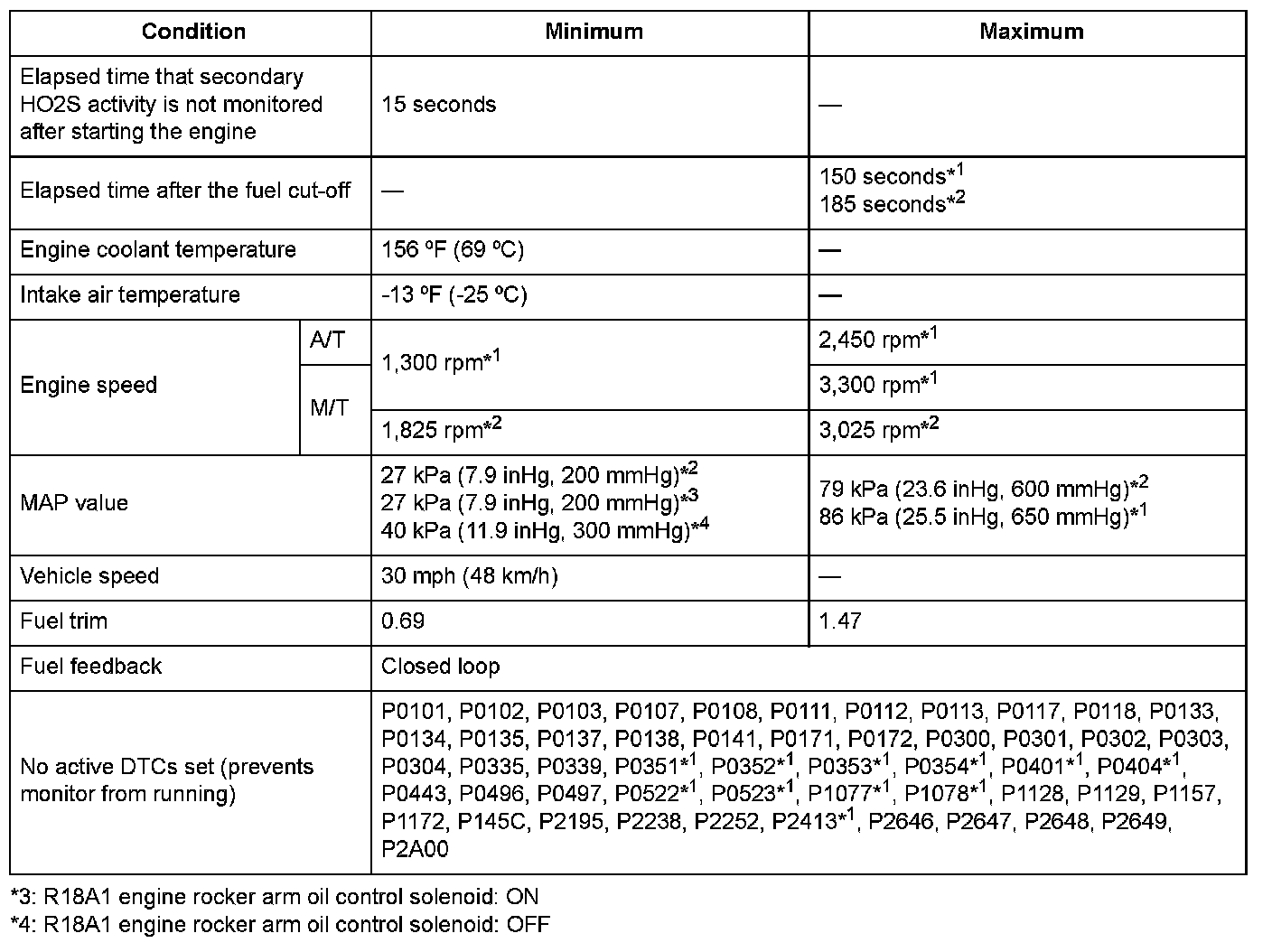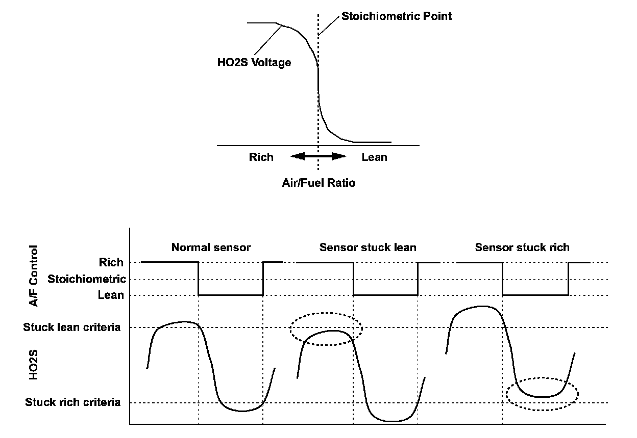 The secondary heated oxygen sensor (secondary HO2S (sensor 2)) detects the oxygen concentration in the exhaust gas downstream of the three way catalyst (TWC). The sensor output voltage characteristics are similar to the air/fuel ratio (A/F) sensor. The oxygen concentration is detected after the TWC during fuel feedback control using the A/F sensor, and it optimizes the fuel feedback control to maximize the effect of the TWC. If, after current is applied to the secondary HO2S heater, the secondary HO2S does not fluctuate and the output is stuck within the specified area, a malfunction is detected and a DTC is stored.