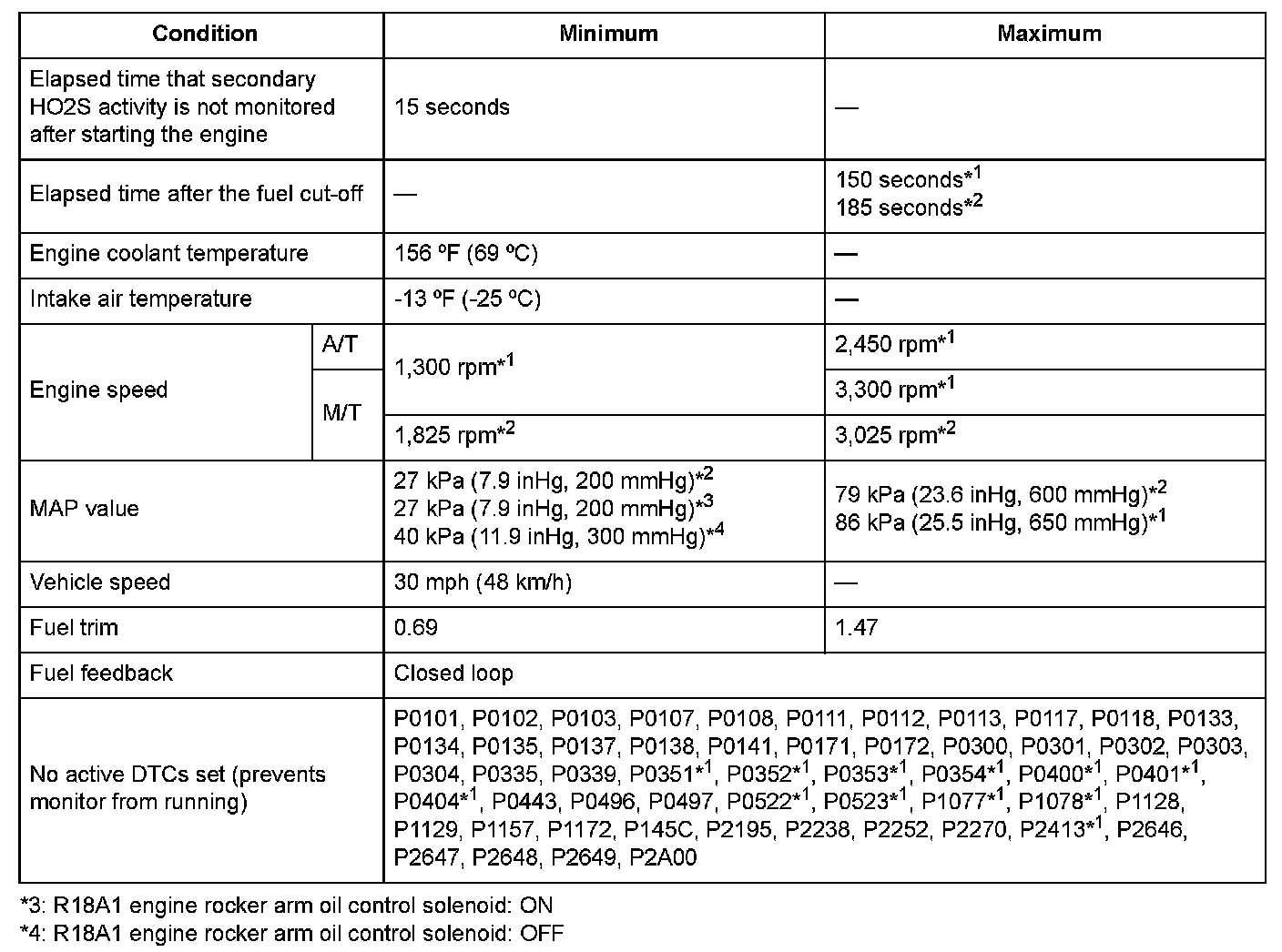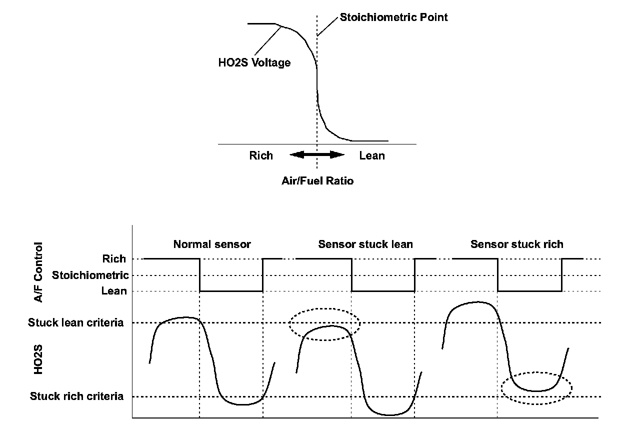 The secondary heated oxygen sensor (secondary HO2S (sensor 2)) detects the oxygen concentration in the exhaust gas downstream of the three way catalyst (TWC). The sensor output voltage characteristics are similar to the air/fuel ratio (A/F) sensor. The oxygen concentration is detected after the TWC during fuel feedback control using the A/F sensor, and it optimizes the fuel feedback control to maximize the effect of the TWC. If, after current is applied to the secondary HO2S heater, the secondary HO2S does not fluctuate and the output is stuck within the specified area, a malfunction is detected and a DTC is stored.