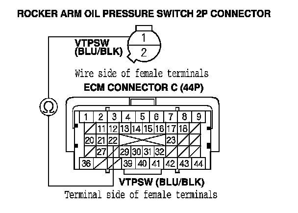 14. Check for continuity between rocker arm oil pressure switch 2P connector terminal No. 1 and ECM connector terminal C22.