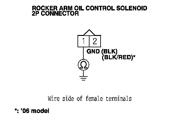 7. At the solenoid side, measure the resistance between rocker arm oil control solenoid 2P connector terminals No. 1 and No. 2.