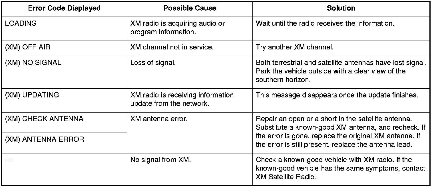 The audio system displays error codes when a problem is detected with the disc changer, the disc, the XM radio, or the anti-theft code. This is not a complete list of audio error codes. Refer to symptom troubleshooting, or go to any official Honda service website for more service information.