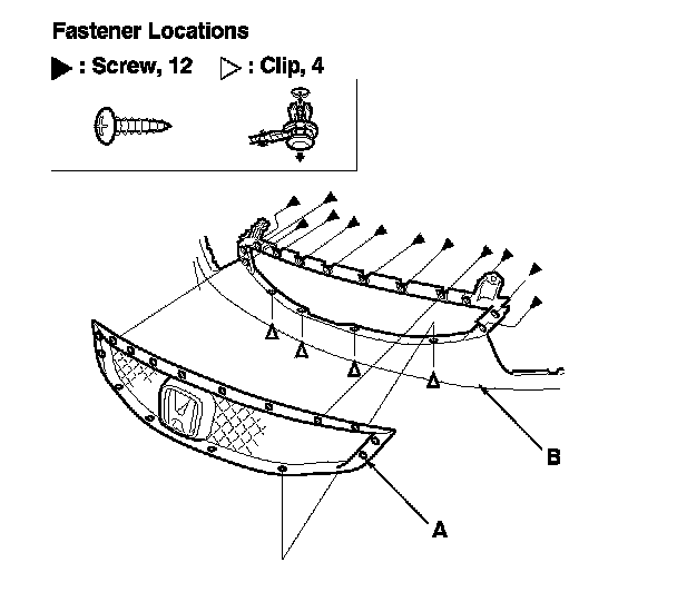 2. Remove the screws and detach the clips, then remove the front grille (A) from the front bumper (B).