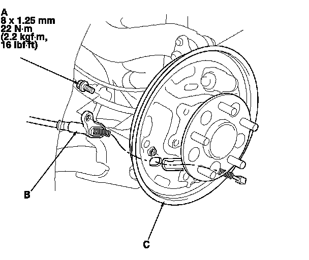 4. Remove the flange bolt (A) and parking brake cable (B) from the backing plate (C).