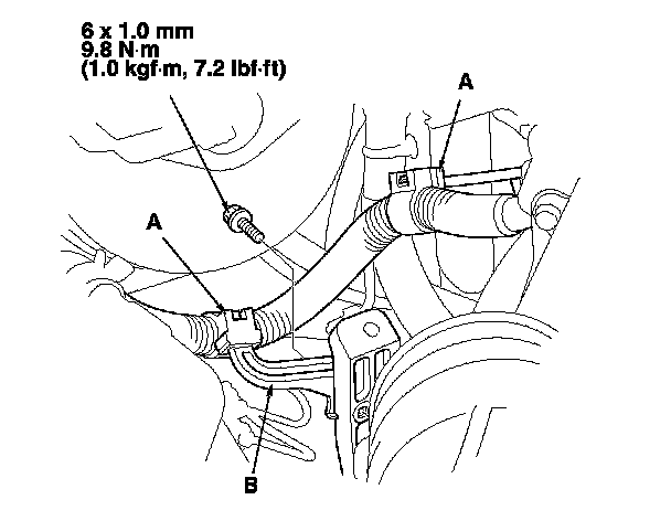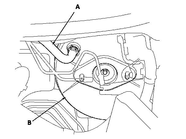 2. Disconnect the brake booster vacuum hose (A) from the brake booster (B).