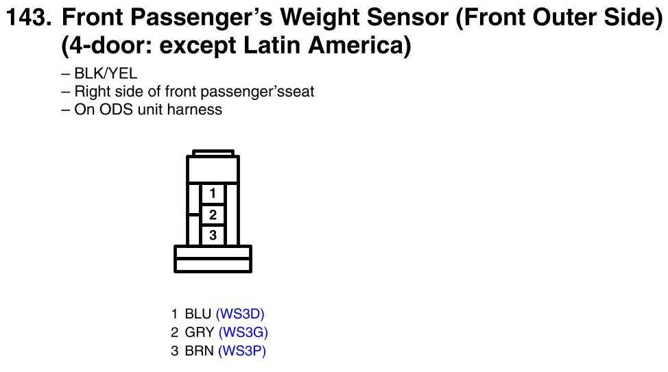 View 143 - Front Passenger's (Front Outer Side) Weight Sensor Connector View (4-door: except Latin America)