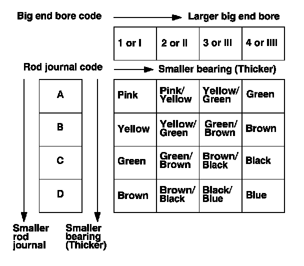 4. Use the big end bore codes and rod journal codes to select the appropriate replacement bearings from the following table.