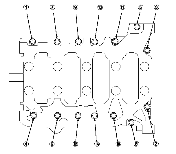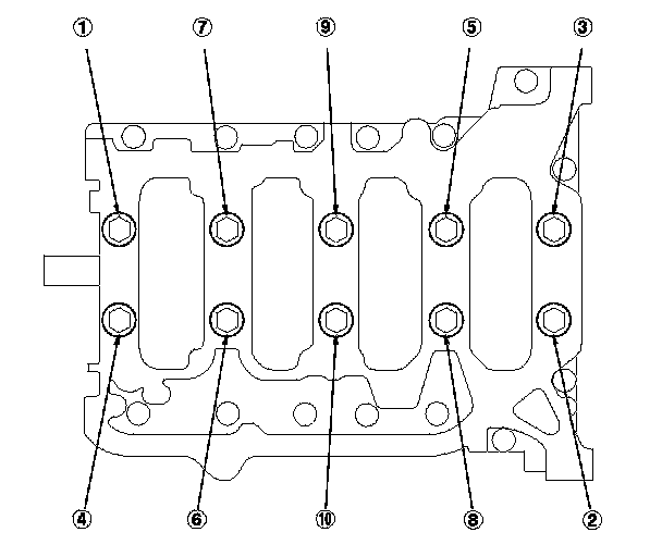 9. Remove the bearing cap bolts. To prevent warpage, loosen the bolts in sequence 1/3 turn at a time; repeat the sequence until all bolts are loosened.