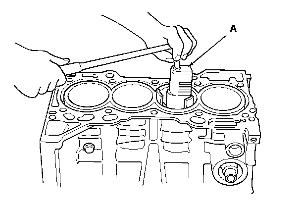 14. If you can feel a ridge of metal or hard carbon around the top of each cylinder, remove it with a ridge reamer (A). Follow the reamer manufacturer's instructions. If the ridge is not removed, it may damage the pistons as they are pushed out.