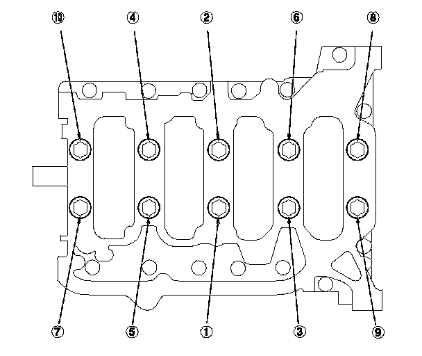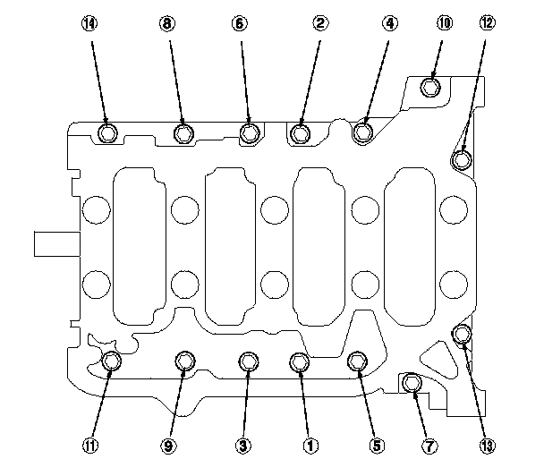 19. Torque the bearing cap bolts, in sequence, to 29 N-m (3.0 kgf-m, 22 lbf-ft).