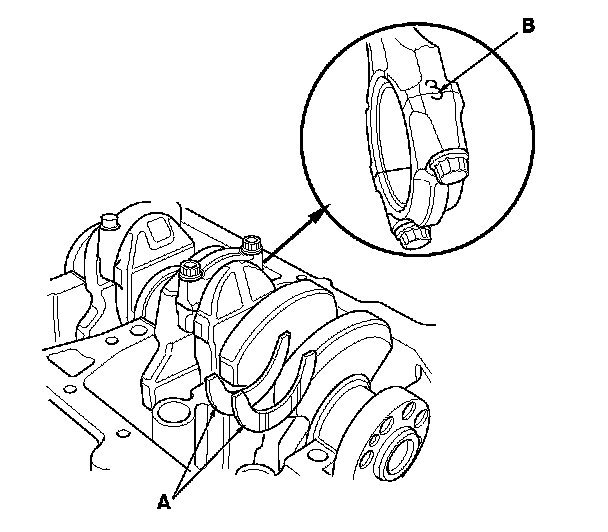 10. Seat the rod journals into connecting rod No. 1 and connecting rod No. 4. Line up the mark (B) on the connecting rod and the cap, then install the caps and the bolts finger-tight.