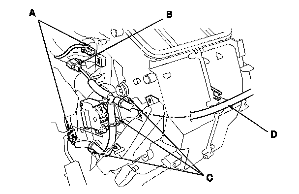 10. Disconnect the connectors (A) from the air mix control motor and A/C wire harness. Remove the connector clip (B), the wire harness clips (C), and the wire harness (D).