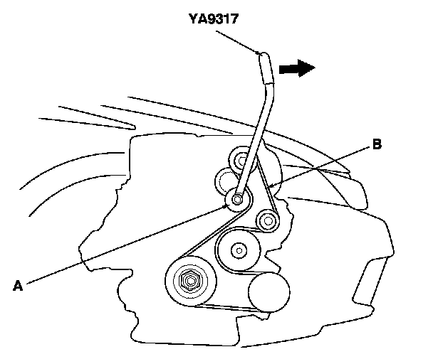 1. Move the auto-tensioner (A) using the belt tension release tool to relieve tension from the drive belt (B), then remove the drive belt.