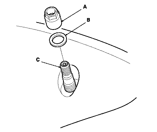 6. Remove the valve stem nut (A) and the washer (B), then remove the tire pressure sensor with the valve stem (C) from the wheel.