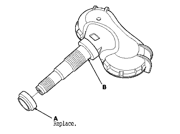 7. Remove and discard the valve stem grommet (A) from the tire pressure sensor (B).