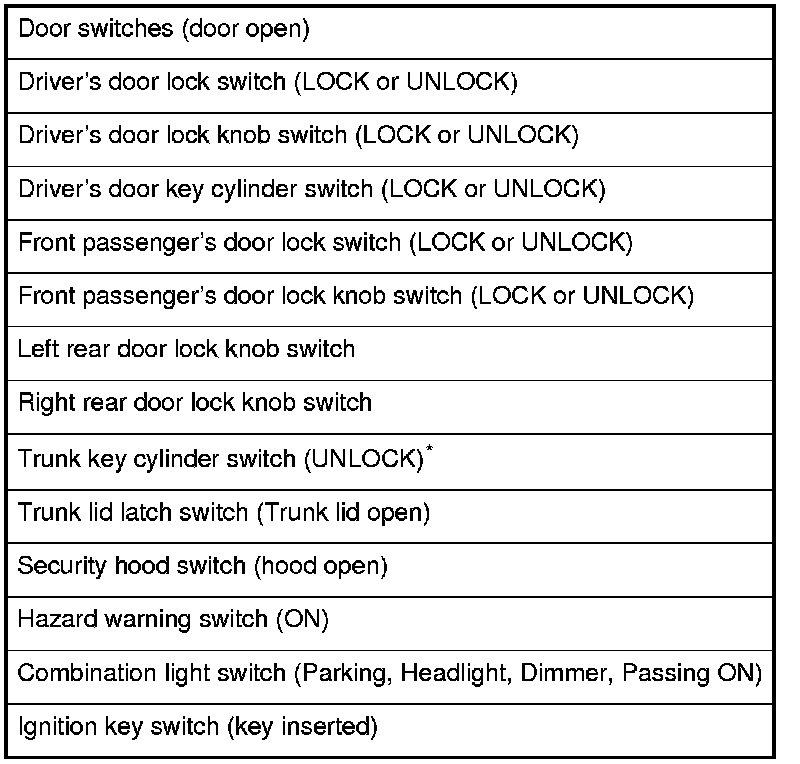 NOTE: If any control unit is faulty and will not wake up, several circuits in the system will malfunction at the same time. In the table, the control unit is followed by a list of the switches and input signals that can wake it up.