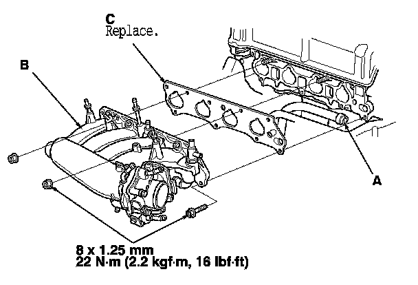 Connect the water bypass hose (A) to the intake manifold (B), then install the intake manifold with a new gasket (C), and tighten the bolts and the nuts in a crisscross pattern in three steps, beginning with the inner bolt.Raise the vehicle on the lift.