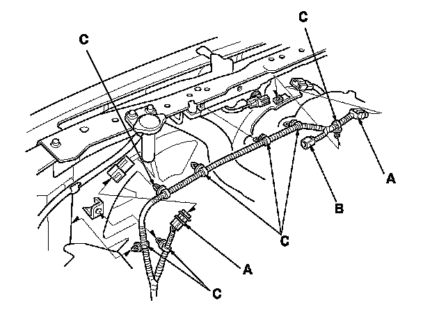 6. Connect the fan motor connectors (A) and the hood switch connector (B), then install the harness clamps (C).