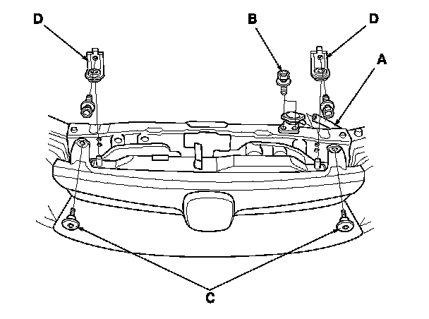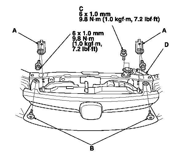 5. Install the radiator upper brackets (A), the clips (B), the radiator cap base mounting bolts (C), and reservoir hose (D).
