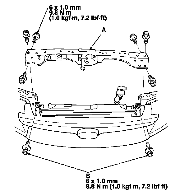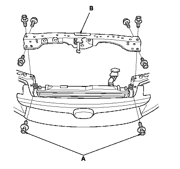 6. Remove the condenser bracket mounting bolts (A), then remove the bulkhead (B).